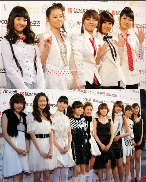 lthough “Into the New World” was a powerful debut, no one predicted SNSD to reach the “world-star” status it currently holds. At the time, the girls were merely a relief for the male audience tired of the boy bands’ dominance of the music market. Right away, the girls faced a tremendous challenge: in September of 2007, the Wonder Girls released their hit single, “Tell Me“. The Wonder Girls were a group that had already been promoting for several months, and their single rocketed them into international fame, as students, police officers, and even soldiers participated in the “Tell Me” dance craze. With the nation hit with the “Wonder Girls Syndrome”, SNSD was dismissed as a B-level girl group. In 2008, Wonder Girls defined K-Pop as “Nobody” and “So Hot” dominated the charts. Although SNSD garnered many male fans with their cute and innocent concept, the girls were not yet considered nationally popular.